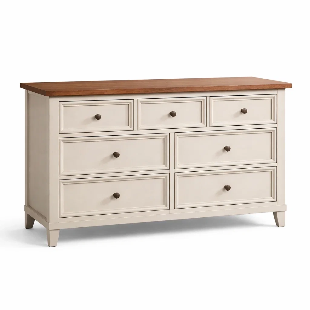 Cassettiera in legno massello bianco crema con piano in rovere e cassetti