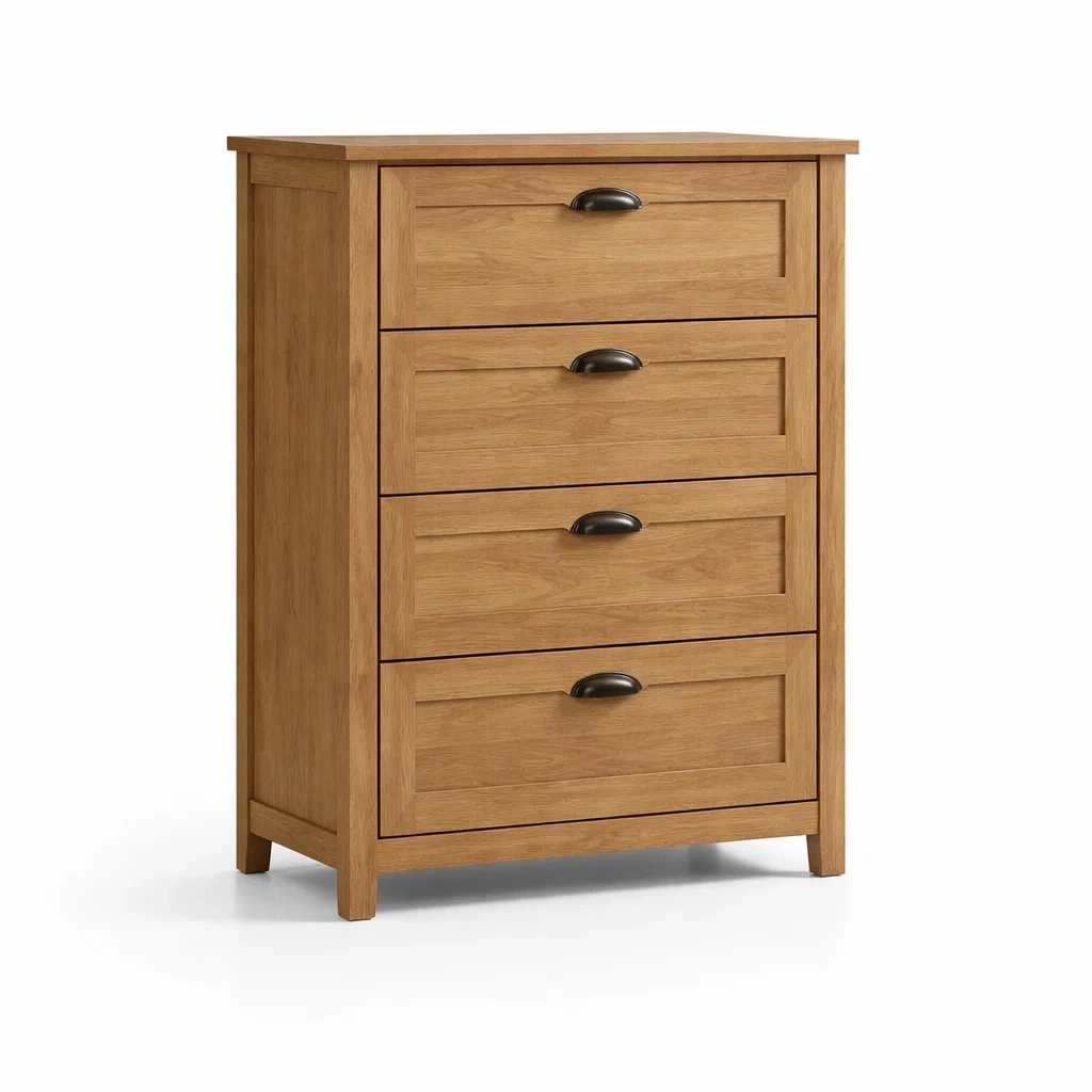 Cassettiera in legno di quercia con cassetti e maniglie nere