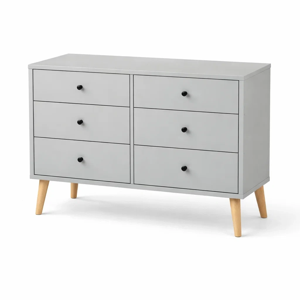 Sei cassetti con maniglie nere, gambe in legno massello. Tipo di guide cassetti a scorrimento semplice.