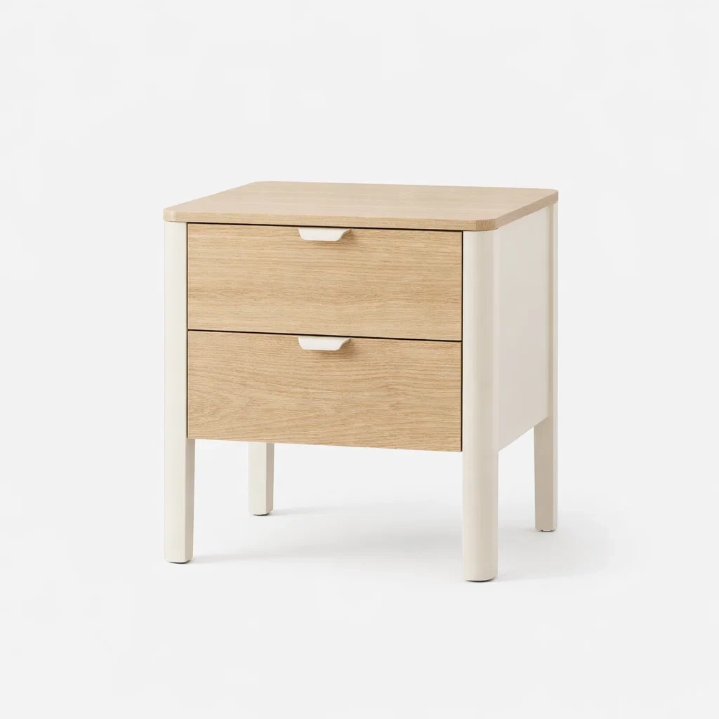 Il comodino è realizzato in legno di rovere e MDF con finitura bianca. Le dimensioni sono 50x40x55 cm. Comprende due cassetti per lo stoccaggio.