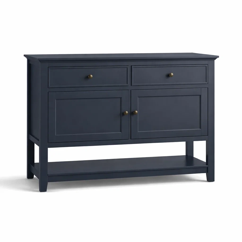 Credenza realizzata in legno blu con due cassetti superiori e due ante inferiori. Include uno scaffale inferiore aperto per ulteriore spazio di archiviazione. Dimensioni: lunghezza 120 cm, larghezza 35 cm, altezza 85 cm. Peso: 25 kg.