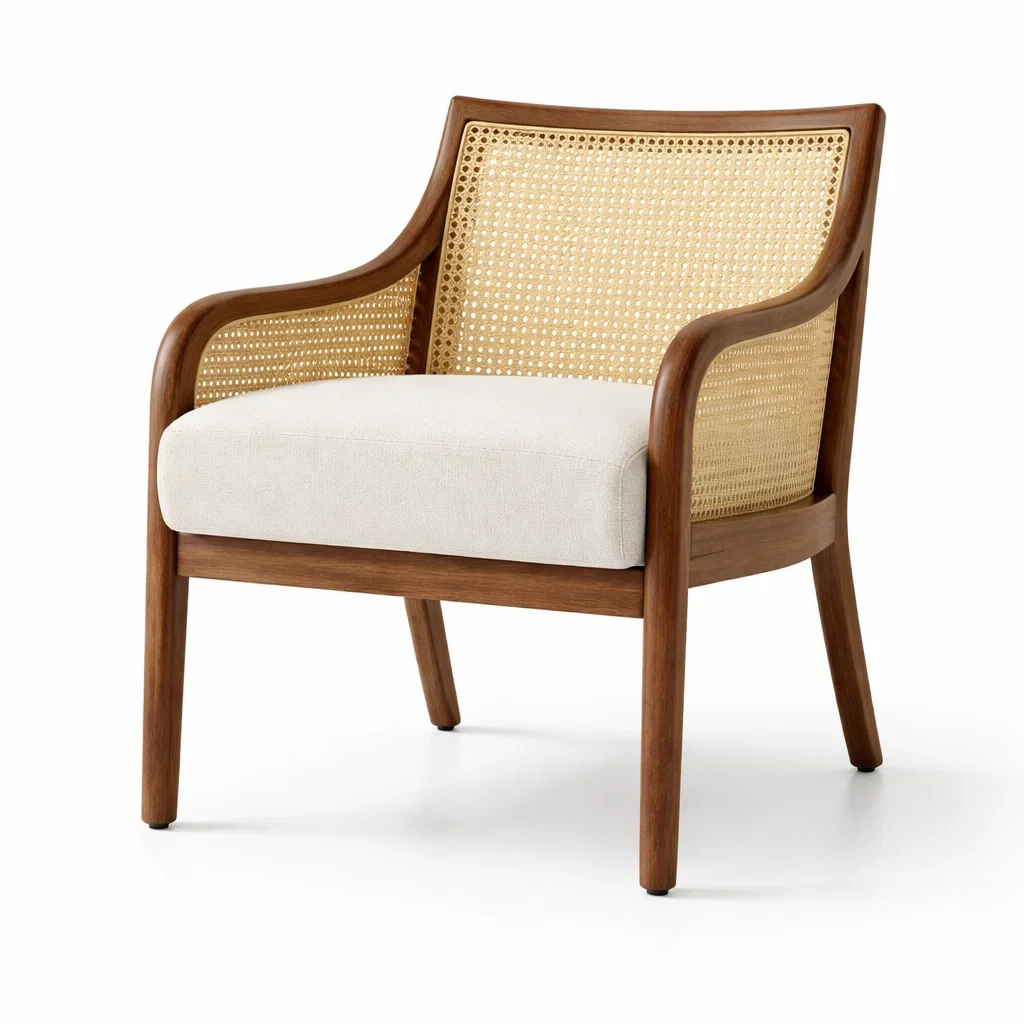 La poltrona è realizzata in legno massello con schienale in rattan naturale. Il cuscino è in schiuma con rivestimento in tessuto di poliestere colore crema.